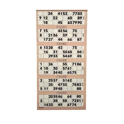 1-90 Bingo Tickets With 6 Tickets To A Strip 600 Tickets 100 Sheets of 6 With Unique Serial Numbers No Staples, Each Sheet Is Glued But Easily Separated Each Ticket is perforated for easy splitting Peach border coloured tickets with sequential serial numbers., Manufacturer: Bingosupermarket