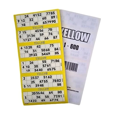 1-90 Yellow Bingo Tickets With 6 Tickets To A Strip 600 Tickets 100 Sheets of 6 With Unique Serial Numbers No Staples, Each Sheet Is Glued But Easily Separated Each sheet of 6 Tickets has perforations so they can be easily split into single bingo tickets, Manufacturer: Bingosupermarket