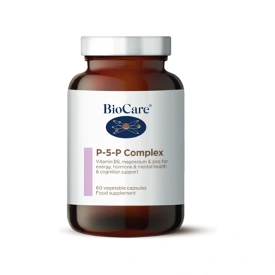 BioCare's P-5-P Complex is a potent blend of vitamins B6, B2, magnesium and zinc. It supports energy, hormone balance, mental health and cognition. • Vitamins B6, B2 and magnesium support energy production • Can help balance hormones • Zinc can improve cognition, fertility and immunity • The biologically active B6, pyridoxal-5-phosphate is easily absorbed. • Supports synthesis of DNA • Can contribute to healthier hair, skin and nails Powerful combination of selected vitamins and minerals that contribute to energy production and DNA synthesis. The active form of Vitamin B6 is better absorbed and utilised by the body. Can be used by vegans and vegetarians.