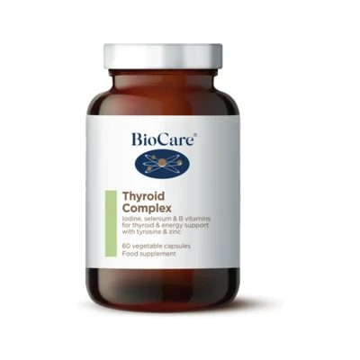 BioCare’s Thyroid Complex is a unique combination of powerful nutrients for energy and thyroid support (). It contains all the vitamins, minerals and phytonutrients needed to enhance thyroid function. • Contains B2 and B3 that can boost energy and contribute to the reduction of tiredness and fatigue • With selenium, an important antioxidant to support normal thyroid function • Includes tyrosine, a nutrient required by the thyroid gland • Siberian ginseng enhances energy production • Iodine is used in the production of thyroid hormones • Vegetarian and vegan formula This potent formulation provides the thyroid with support for optimal function and production of thyroid hormones. Includes key ingredients and co-factors, without the addition of unnecessary additives or allergens.