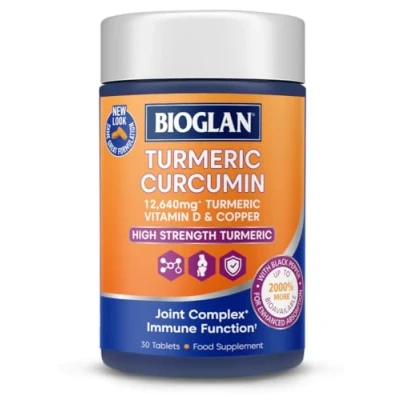 High Strength Curcumin Formula: Bioglan Active Curcumin contains 95% curcuminoids, offering maximum benefits compared to standard turmeric products. Enhanced Absorption: Includes BioPerine black pepper extract, scientifically proven to enhance curcumin absorption for better results. Supports Inflammation Management: Curcumin is known for its role in managing the body's inflammatory responses, promoting overall well-being. Nutrients for Joint & Immune Support: Includes Copper for normal connective tissue health, Vitamin D for strong bones, and Vitamin C for immune system support. Quality & Potency: Bioglan Active Curcumin provides an advanced, highly concentrated curcumin formula for those seeking maximum benefit.