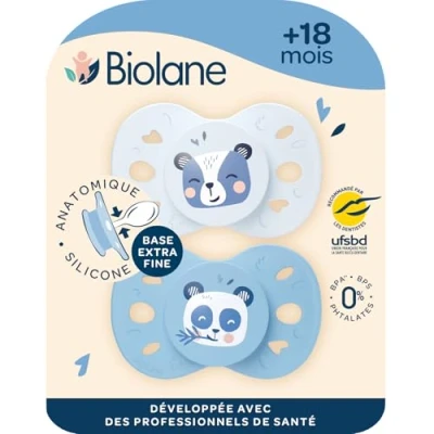 Oral development: Biolane teats have an extra-fine base (-40% compared to a standard pacifier) that allow good lip closure, limits the risk of dental gaping and ensures the proper oral development of your baby. ANATOMIC AND ERGONOMIC TEAT: The flat nipple of the Biolane dummy is reversible, it allows your baby to put it in the mouth easily, on both sides. Ergonomic, it will always be well positioned. RECOMMENDED BY HEALTH PROFESSIONALS: Biolane teats have been developed in collaboration with healthcare professionals. They are also recommended by the French Union for Oral Health (UFSBD), a public body committed to the prevention of oral health. Soft and comfortable: The soft and pleasant silicone nipple ensures optimal comfort for your baby. Its butterfly shape, combined with the ventilation holes on the shield, allows good breathing while protecting your baby's skin from irritation. SAFE AND SUSTAINABLE MATERIALS: Biolane pacifiers are designed with plant-based and recycled raw materials. They are guaranteed BPA, BPS and phthalate free and are made in Western Europe.