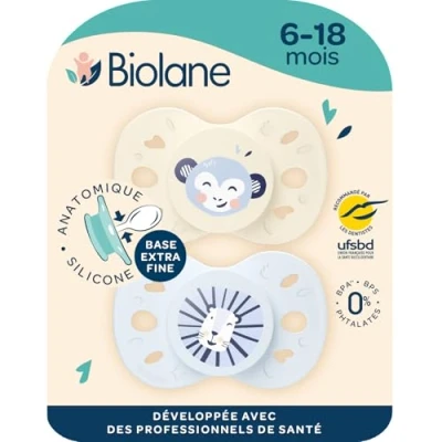 Oral development: Biolane teats have an extra-fine base (-40% compared to a standard pacifier) that allow good lip closure, limits the risk of dental gaping and ensures the proper oral development of your baby. ANATOMIC AND ERGONOMIC TEAT: The flat nipple of the Biolane dummy is reversible, it allows your baby to put it in the mouth easily, on both sides. Ergonomic, it will always be well positioned. RECOMMENDED BY HEALTH PROFESSIONALS: Biolane teats have been developed in collaboration with healthcare professionals. They are also recommended by the French Union for Oral Health (UFSBD), a public body committed to the prevention of oral health. Soft and comfortable: The soft and pleasant silicone nipple ensures optimal comfort for your baby. Its butterfly shape, combined with the ventilation holes on the shield, allows good breathing while protecting your baby's skin from irritation. SAFE AND SUSTAINABLE MATERIALS: Biolane pacifiers are designed with plant-based and recycled raw materials. They are guaranteed BPA, BPS and phthalate free and are made in Western Europe.