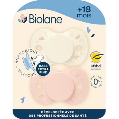 Oral development: Biolane teats have an extra-fine base (-40% compared to a standard pacifier) that allow good lip closure, limits the risk of dental gaping and ensures the proper oral development of your baby. ANATOMIC AND ERGONOMIC TEAT: The flat nipple of the Biolane dummy is reversible, it allows your baby to put it in the mouth easily, on both sides. Ergonomic, it will always be well positioned. RECOMMENDED BY HEALTH PROFESSIONALS: Biolane teats have been developed in collaboration with healthcare professionals. They are also recommended by the French Union for Oral Health (UFSBD), a public body committed to the prevention of oral health. Soft and comfortable: The soft and pleasant silicone nipple ensures optimal comfort for your baby. Its butterfly shape, combined with the ventilation holes on the shield, allows good breathing while protecting your baby's skin from irritation. SAFE AND SUSTAINABLE MATERIALS: Biolane pacifiers are designed with plant-based and recycled raw materials. They are guaranteed BPA, BPS and phthalate free and are made in Western Europe.