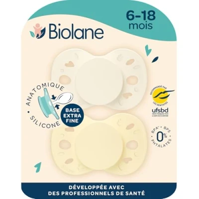 Respect for oral development: Biolane teats have an extra-fine base (-40% compared to a standard pacifier) that allows good lip closure, limits the risk of dental gaping and ensures the proper oral development of your baby ANATOMIC AND ERGONOMIC TEATS: The Biolane teat is reversible, it allows your baby to put it in the mouth easily, on either side; ergonomic, it will always be well positioned RECOMMENDED BY HEALTH PROFESSIONALS: Biolane teats have been designed in collaboration with health professionals; they are also recommended by the French Union for Oral Health (UFSBD), a public body committed to the prevention of oral health Soft and comfortable: The silicone nipple is soft and pleasant, ensuring optimal comfort for your baby. The butterfly shape of the shield is hollowed out at the nose so as not to hinder breathing; The shield is made of ventilation holes which protect your baby's skin from irritation SAFE AND RENEWABLE MATERIALS: Biolane pacifiers are designed with renewable materials (ISCC+ certified); they are guaranteed 0% BPA, BPS and phthalates and are made in Europe