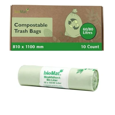 📦 EASY TO USE AND STORE: These 80 litre compostable wheelie bin liners (10 bags) measure 810 x 1200 mm and are supplied on a practical roll. They provide a hygienic and reliable solution for disposing of household waste, food waste, and act as large bin liners and refuse sacks. Please store your compostable food waste bags in a cool and dark place. 🌽 PREMIUM QUALITY: Made in Germany with more than 30 years of experience! Our bioMat compostable bin liners are made from renewable raw materials such as corn starch and fit into most 80 litre wheelie bins. The proven multi-layer film technology guarantees leakproof use, tear resistance, and helps to save valuable resources. 🌱 CERTIFIED COMPOSTABLE: These biodegradable wheelie bin liners are certified to EN 13432, OK Compost Home, OK Compost Industrial and ASTM D6400. These internationally recognised standards ensure that the bags break down safely without leaving harmful residues or persistent microplastics. ✅ LEAKPROOF AND DURABLE: Designed for household waste, food waste, and organic waste, the sacks are made with the proven multi-layer film technology, providing excellent tear resistance, leak protection, and durability. They help contain moisture, reduce unpleasant odours, and function as strong refuse sacks for large wheelie bins. 🌍 GREEN MANUFACTURING: Our biodegradable bin liners are manufactured in our production facility using 100% green electricity and thermal power stations. The wheelie bin bags are printed with waterbased inks and are fully compostable. Our family business strives to minimize the ecological footprint of our production and our products.