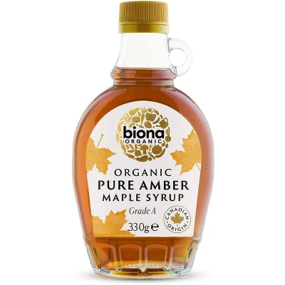 Biona Organic Amber Maple Syrup 330g is a pure, organic Grade A syrup from Canada’s Bas-St-Laurent region, offering rich caramel and vanilla notes, a stronger taste than golden syrup, and is strictly vegan with no artificial additives.