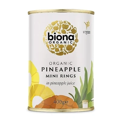 Organic & Vegan Mini pineapple rings in Pineapple juice Perfectly ripened Sliced and packed fresh in its own juice Perfect for topping muesli and breakfast cereal, or adding to smoothies and desserts