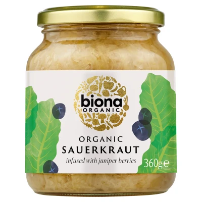 Biona Organic Sauerkraut 360g is a tangy, fermented side dish made from 97% organic white cabbage and juniper berries. Its low in fat and sugar, with no allergens, and perfect for adding flavor to meals.