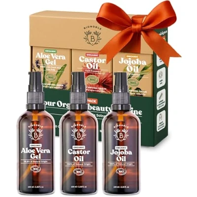 🎁 A GREAT GIFT FOR ALL OCCASIONS; For your mother's birthday, your best friend's housewarming, your sister's Christmas gift or as a nanny gift! Treat your loved ones with a beautiful gift box at a good price. 💦 ORGANIC ALOE VERA GEL; Moisturises and protects: anti-ageing & acne moisturising serum, anti-itching, soothing after-sun. 🍁 ORGANIC CASTOR OIL; Stimulates growth: long, shiny hair, denser lashes, a soft beard and strong nails. 🌰 ORGANIC JOJOBA OIL; Repairs and softens: reduces imperfections, prevents dehydration and makes your hair shine. 🥇 100% SATISFACTION PROMISE; Bionoble is French brand. All our products are dermatologically tested, vegan and not tested on animals 🐰. A question? Contact us via Amazon, answer within 24 hours!