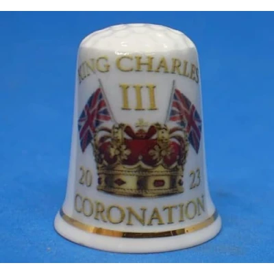 Birchcroft Porcelain China Collectible Thimble King Charles Coronation with Crown Dome Box