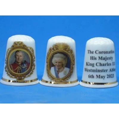Birchcroft Porcelain China Collectible Thimbles Charles & Camilla Coronation Pair With Dome Boxes