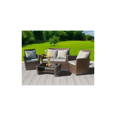 " Product Features: * 4 pieces Rattan Sofa Set complete with Chairs and Coffee Table, fashion to be use at patio, garden, conservatory to enjoy leisure times. * Anti-rust powder-coated iron frame, sturdy and durable to use. * Manual premium PE rattan weave with wipe-clean surface, UV treated and fade resistant for long year use. * Removable thick padded cushions and pillows for long comfortable seating. * Waterproof cushions are covered with 180g polyester fabric, which are removable & washable zippered. * Included with a stable coffee table with removable tempered safety glass top and storage space. * Plastic feet to protect your floors. Elevates to protect the bottom of the frame from damage. * Arrives Flat Packed. Instruction manual is provided with the purchase along with all the relevant screws & fittings. Product Specification: * Model No.: RFS02; * Colour: Brown; * Material: Powder-coated Iron Frame, PE Rattan, Polyester; * 2 Seater Sofa Size: 117(L) x 66(D) x 76(H)CM; * 2