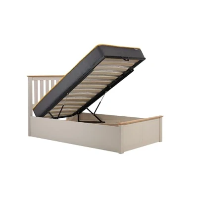 Constructed from solid rubberwood, the oak option has MDF veneered side rails whereas the white option features MDF Melamine side rails. This frame has a sprung slatted base to give natural bounce, adjusting to where pressure is most exerted to provide greater comfort. The gas piston strength on this frame is 588 N and can support mattresses up to the weight of 45 kg. The maximum weight load for the Phoenix Ottoman frame is 170 kg. Please note the mattress needs to be on the bed for the pistons to work. Birlea beds are only suitable for a UK standard size mattress and the recommended maximum mattress height is 203 mm. If your desired room of choice has a non carpeted surface please ensure that you use some form of anti-slip protection and do not place directly on the wooden floor. Please note that felt pads are not considered suitable anti-slip protection Storage space dimensions: Headboard to centre divide - 119cm Footboard to centre divide - 74cm