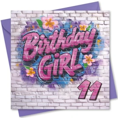 Birthday Card Age 11. Graffiti Girl Design. with Envelope. 150x150mm supplied Eco friendly. Message inside. Made in Britain.
