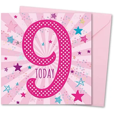Birthday Card Age 9. Girl with Matching Envelope. Pink Starburst design. size 148x148mm. Eco friendly. Message inside. Printed and Packed in UK.