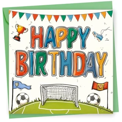 Birthday Card Football Design. 150x150mm supplied with Envelope. Eco friendly. Message inside. Made in Britain.Football for Boy or Girl, Son, Daughter, Dad, Brother, Husband