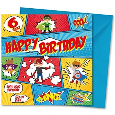 Birthday Card for Boy Age 6. with Matching Envelope. Comic Strip design. size 148x148mm. Eco friendly. Message inside. Printed and Packed in UK.