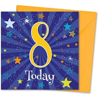 Birthday Card for Boy Age 8. with Matching Envelope. Star Burst design. size 148x148mm. Eco friendly. Message inside. Printed and Packed in UK.