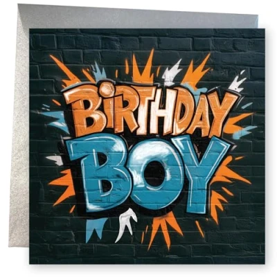 Birthday Card for Boy. Graffiti with Gloss Text Design. 150x150mm supplied Envelope. Eco friendly. Message inside. Made in Britain.