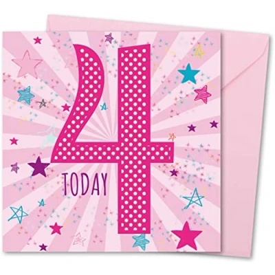 Birthday Card for Girl Age 4. with Matching Envelope. Pink Star Burst design. size 148x148mm. Eco friendly. Message inside. Printed and Packed in UK.