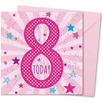 Birthday Card for Girl Age 8. with Matching Envelope. Pink Star Burst design. size 148x148mm. Eco friendly. Message inside. Printed and Packed in UK.