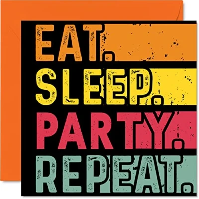 MAKE THEM SMILE WITH THIS FUN CARD: This exceptional quality birthday card for her or him shows the design 'Eat, Sleep, Party, Repeat'. If you are looking for fun greetings cards for any occasion, then then this card is bound to make anyone smile. Not just for friendship gifts for women this could also be for Son, Daughter, Brother, Sister, Colleague, Cousin, Auntie or Uncle. WHAT DO YOU GET: The card is printed on one side and BLANK ON THE INSIDE to allow you to write your very own message. The unique fun design is printed on a specially sourced and environmentally responsible board. At 360 microns thick the natural white one-sided gloss board has a quality look and feel. Supplied with a coloured gummed envelope to complement the design and ready to be sealed and sent in the post. Party birthday card NO INK SMUDGES: There is nothing worse than writing inside a card to find that the shiny surface makes the ink smudge. This is why we use a high quality one sided coated board. The uncoated side will absorb more of the ink from your pen to make smudging a thing of the past. 18th 21st 30 40th 50th 60th birthday card. SIZES: Greeting Card = 145mm x 145mm, Envelope = 155mm x 155mm, Card Thickness = 360 micron. Great Son or Daughter birthday cards from Mum or Dad. Banter Birthday cards. Party Music Dance birthday card. MADE AND QUALITY CHECKED IN THE UK: We print and manufacture all our product right her in the UK so you can be sure of a fast turnaround and a product that is expertly made. Using environmentally responsible premium board our card is conscious of the responsible management of the world's forests - happy birthday cardParty greeting cards.