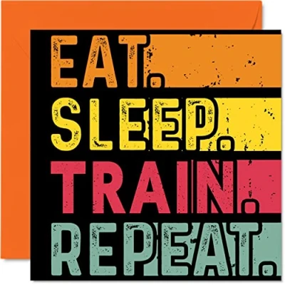 Birthday Card Funny for Her or Him Eat, Sleep, Train, Repeat Happy Cards Workout Fitness Lovers Gifts, 145mm x Greeting All Occasions Kids Adult