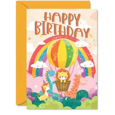 Birthday Card Girls Boys Hot Air Balloon Rainbow Happy for Girl Boy Kids, A5 Bday Animal Greeting Cards