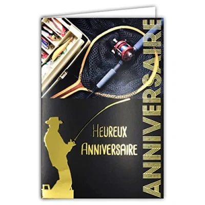 Birthday Card in Shiny Gold for Fisherman Fishing Rod Reel Landing Net Bait Animals Nature Comes with Envelope Size 12 x 17.5 cm PEFC Paper Made France 65 1209