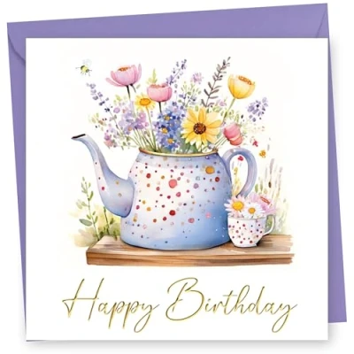 Birthday Card. Teapot with Gold Foil text Design. Card Purple Envelope. 150 x 150mm when folded. Message inside. Made in Britain.