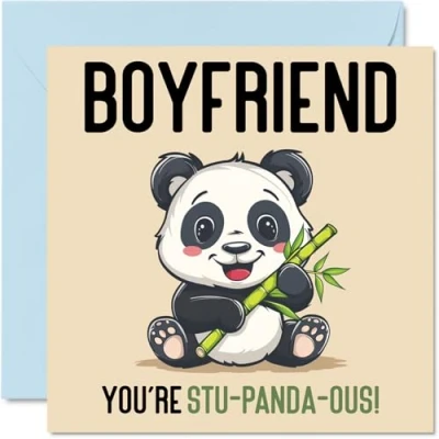 MAKE YOUR BOYFRIEND LAUGH WITH THIS FUNNY BIRTHDAY CARD BOYFRIEND: This exceptional quality birthday card for him shows the design of a cute Panda with the words "Boyfriend You're Stu-Panda-ous". If you are looking for beautiful birthday greetings cards for him, then this funny happy birthday card is bound to make them smile. Not just for birthday gifts for Boyfriend this could also be a birthday card for your Boyfriend or Partner. WHAT DO YOU GET: The card is printed on one side and BLANK ON THE INSIDE to allow you to write your very own message. The unique fun design is printed on a specially sourced and environmentally responsible board. At 360 microns thick the natural white one-sided gloss board has a quality look and feel. Supplied with a coloured gummed envelope to complement the design and ready to be sealed and sent in the post. NO INK SMUDGES: There is nothing worse than writing inside a card to find that the shiny surface makes the ink smudge. This is why we use a high quality one sided coated board. The uncoated side will absorb more of the ink from your pen to make smudging a thing of the past. Happy birthday Boyfriend cards, Boyfriend birthday card, Boyfriend birthday cards, 40th birthday card for him, 30th birthday cards for men. SIZES: Greeting Card = 148mm x 210mm, Envelope = 150mm x 212mm, Card Thickness = 360 micron. Great Boyfriend birthday cards from Girlfriend. Boyfriend birthday cards from Boyfriend, birthday card Boyfriend, Boyfriend birthday card, special Boyfriend birthday cards. MADE AND QUALITY CHECKED IN THE UK: We print and manufacture all our product right her in the UK so you can be sure of a fast turnaround and a product that is expertly made. Using environmentally responsible premium board our card is conscious of the responsible management of the world's forests - birthday cards Boyfriend, Boyfriend birthday card, Boyfriends birthday card.