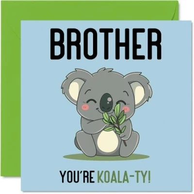 MAKE YOUR BROTHER LAUGH WITH THIS FUNNY BIRTHDAY CARD BROTHER: This exceptional quality birthday card for him shows a design of a cute Koala with the words "Brother You're Koala-Ty". If you are looking for beautiful birthday greetings cards for him, then this happy birthday card is bound to make them smile. Not just for birthday gifts for Brother this could also be a birthday card for your Brother or Brother in Law. WHAT DO YOU GET: The card is printed on one side and BLANK ON THE INSIDE to allow you to write your very own message. The unique fun design is printed on a specially sourced and environmentally responsible board. At 360 microns thick the natural white one-sided gloss board has a quality look and feel. Supplied with a coloured gummed envelope to complement the design and ready to be sealed and sent in the post. NO INK SMUDGES: There is nothing worse than writing inside a card to find that the shiny surface makes the ink smudge. This is why we use a high quality one sided coated board. The uncoated side will absorb more of the ink from your pen to make smudging a thing of the past. Happy birthday Brother cards, Brother birthday card, 30th birthday card for him, 21st birthday cards for men. SIZES: Greeting Card = 148mm x 210mm, Envelope = 150mm x 212mm, Card Thickness = 360 micron. Great Brother birthday cards from Sister and Brother. Brother birthday cards from Brother, birthday card Bro, Bro birthday card, special Brother birthday cards. MADE AND QUALITY CHECKED IN THE UK: We print and manufacture all our product right her in the UK so you can be sure of a fast turnaround and a product that is expertly made. Using environmentally responsible premium board our card is conscious of the responsible management of the world's forests - birthday cards Brother, Brother birthday card, Brothers birthday card.