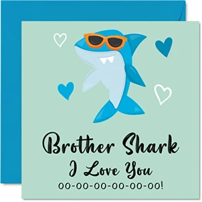 MAKE YOUR BROTHER SMILE WITH THIS BEAUTIFUL BIRTHDAY CARD: This exceptional quality birthday card for your Brother shows the design "Brother Shark Do-Do-Do I Love You". If you are looking for beautiful birthday greetings cards for him, then then this happy birthday day card is bound to make them laugh. Not just for birthday gifts for Brother this could also be a Christmas card. WHAT DO YOU GET: The card is printed on one side and BLANK ON THE INSIDE to allow you to write your very own message. The unique fun design is printed on a specially sourced and environmentally responsible board. At 360 microns thick the natural white one-sided gloss board has a quality look and feel. Supplied with a coloured gummed envelope to complement the design and ready to be sealed and sent in the post. Birthday card for Brother. NO INK SMUDGES: There is nothing worse than writing inside a card to find that the shiny surface makes the ink smudge. This is why we use a high quality one sided coated board. The uncoated side will absorb more of the ink from your pen to make smudging a thing of the past. Brother birthday cards from Brother, birthday cards for Brother, Brother birthday card. SIZES: Greeting Card = 145mm x 145mm, Envelope = 155mm x 155mm, Card Thickness = 360 micron. Great Brother banter birthday cards from Step Brother. Brother birthday cards, Brother banter card, happy birthday Brother card. MADE AND QUALITY CHECKED IN THE UK: We print and manufacture all our product right her in the UK so you can be sure of a fast turnaround and a product that is expertly made. Using the very best Forest Stewardship Council certified board our card is conscious of the responsible management of the world's forests - Birthday cards from Brother, birthday funny cards.