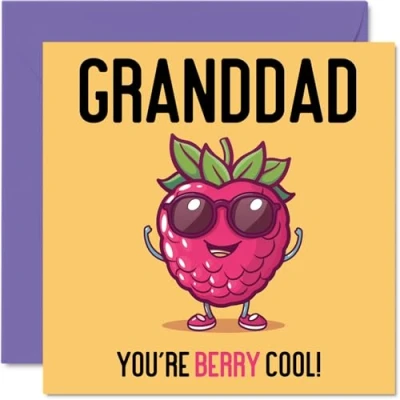 MAKE YOUR GRANDAD LAUGH WITH THIS FUNNY BIRTHDAY CARD GRANDAD: This exceptional quality birthday card for him shows the of a Raspberry with the words "Grandad You're Berry Cool". If you are looking for beautiful birthday greetings cards for him, then this funny happy birthday card is bound to make them smile. Not just for birthday gifts for Grandad this could also be a birthday card for your Grandad, Grandpa or Gramps. WHAT DO YOU GET: The card is printed on one side and BLANK ON THE INSIDE to allow you to write your very own message. The unique fun design is printed on a specially sourced and environmentally responsible board. At 360 microns thick the natural white one-sided gloss board has a quality look and feel. Supplied with a coloured gummed envelope to complement the design and ready to be sealed and sent in the post. NO INK SMUDGES: There is nothing worse than writing inside a card to find that the shiny surface makes the ink smudge. This is why we use a high quality one sided coated board. The uncoated side will absorb more of the ink from your pen to make smudging a thing of the past. Happy birthday Grandad cards, Great Grandad birthday card, Great Grandpa birthday cards, 70th birthday card for him, 80th birthday cards for men. SIZES: Greeting Card = 148mm x 210mm, Envelope = 150mm x 212mm, Card Thickness = 360 micron. Great Grandad birthday cards from Great Grandson and Great Granddaughter. Great Grandpa birthday cards from Grandson, birthday card Great Gramps, Grandad birthday card, Grandpa birthday cards from Great Granddaughter, special Grandparent birthday cards. MADE AND QUALITY CHECKED IN THE UK: We print and manufacture all our product right her in the UK so you can be sure of a fast turnaround and a product that is expertly made. Using environmentally responsible premium board our card is conscious of the responsible management of the world's forests - birthday cards Grandad, Grandad birthday card, Grandads birthday card.