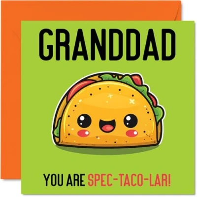 MAKE YOUR GRANDAD LAUGH WITH THIS FUNNY BIRTHDAY CARD GRANDAD: This exceptional quality birthday card for him shows the design of a cute taco with the words "Grandad You Are Spec-Taco-lar!". If you are looking for beautiful birthday greetings cards for him, then this funny happy birthday card is bound to make them smile. Not just for birthday gifts for Grandad this could also be a birthday card for your Grandad, Grandpa or Gramps. WHAT DO YOU GET: The card is printed on one side and BLANK ON THE INSIDE to allow you to write your very own message. The unique fun design is printed on a specially sourced and environmentally responsible board. At 360 microns thick the natural white one-sided gloss board has a quality look and feel. Supplied with a coloured gummed envelope to complement the design and ready to be sealed and sent in the post. NO INK SMUDGES: There is nothing worse than writing inside a card to find that the shiny surface makes the ink smudge. This is why we use a high quality one sided coated board. The uncoated side will absorb more of the ink from your pen to make smudging a thing of the past. Happy birthday Grandad cards, Great Grandad birthday card, Great Grandpa birthday cards, 70th birthday card for him, 80th birthday cards for men. SIZES: Greeting Card = 148mm x 210mm, Envelope = 150mm x 212mm, Card Thickness = 360 micron. Great Grandad birthday cards from Great Grandson and Great Granddaughter. Great Grandpa birthday cards from Grandson, birthday card Great Gramps, Grandad birthday card, Grandpa birthday cards from Great Granddaughter, special Grandparent birthday cards. MADE AND QUALITY CHECKED IN THE UK: We print and manufacture all our product right her in the UK so you can be sure of a fast turnaround and a product that is expertly made. Using environmentally responsible premium board our card is conscious of the responsible management of the world's forests - birthday cards Grandad, Grandad birthday card, Grandads birthday card.