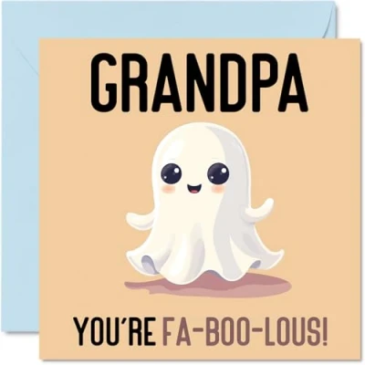 MAKE YOUR GRANDPA LAUGH WITH THIS FUNNY BIRTHDAY CARD GRANDPA: This exceptional quality birthday card for him shows the design of a cute ghost with the words "Grandpa You're Fa-Boo-lous". If you are looking for beautiful birthday greetings cards for him, then this funny happy birthday card is bound to make them smile. Not just for birthday gifts for Grandpa this could also be a birthday card for your Grandpa, Grandad or Gramps. WHAT DO YOU GET: The card is printed on one side and BLANK ON THE INSIDE to allow you to write your very own message. The unique fun design is printed on a specially sourced and environmentally responsible board. At 360 microns thick the natural white one-sided gloss board has a quality look and feel. Supplied with a coloured gummed envelope to complement the design and ready to be sealed and sent in the post. NO INK SMUDGES: There is nothing worse than writing inside a card to find that the shiny surface makes the ink smudge. This is why we use a high quality one sided coated board. The uncoated side will absorb more of the ink from your pen to make smudging a thing of the past. Happy birthday Grandpa cards, Great Grandpa birthday card, Great Grandad birthday cards, 70th birthday card for him, 80th birthday cards for men. SIZES: Greeting Card = 148mm x 210mm, Envelope = 150mm x 212mm, Card Thickness = 360 micron. Great Grandpa birthday cards from Great Grandson and Great Granddaughter. Great Grandad birthday cards from Grandson, birthday card Great Gramps, Grandpa birthday card, Grandad birthday cards from Great Granddaughter, special Grandparent birthday cards. MADE AND QUALITY CHECKED IN THE UK: We print and manufacture all our product right her in the UK so you can be sure of a fast turnaround and a product that is expertly made. Using environmentally responsible premium board our card is conscious of the responsible management of the world's forests - birthday cards Grandpa, Grandpa birthday card, Grandpas birthday card.