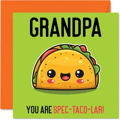 MAKE YOUR GRANDPA LAUGH WITH THIS FUNNY BIRTHDAY CARD GRANDPA: This exceptional quality birthday card for him shows the design of a cute taco with the words "Grandpa You Are Spec-Taco-lar!". If you are looking for beautiful birthday greetings cards for him, then this funny happy birthday card is bound to make them smile. Not just for birthday gifts for Grandpa this could also be a birthday card for your Grandpa, Grandad or Gramps. WHAT DO YOU GET: The card is printed on one side and BLANK ON THE INSIDE to allow you to write your very own message. The unique fun design is printed on a specially sourced and environmentally responsible board. At 360 microns thick the natural white one-sided gloss board has a quality look and feel. Supplied with a coloured gummed envelope to complement the design and ready to be sealed and sent in the post. NO INK SMUDGES: There is nothing worse than writing inside a card to find that the shiny surface makes the ink smudge. This is why we use a high quality one sided coated board. The uncoated side will absorb more of the ink from your pen to make smudging a thing of the past. Happy birthday Grandpa cards, Great Grandpa birthday card, Great Grandad birthday cards, 70th birthday card for him, 80th birthday cards for men. SIZES: Greeting Card = 148mm x 210mm, Envelope = 150mm x 212mm, Card Thickness = 360 micron. Great Grandpa birthday cards from Great Grandson and Great Granddaughter. Great Grandad birthday cards from Grandson, birthday card Great Gramps, Grandpa birthday card, Grandad birthday cards from Great Granddaughter, special Grandparent birthday cards. MADE AND QUALITY CHECKED IN THE UK: We print and manufacture all our product right her in the UK so you can be sure of a fast turnaround and a product that is expertly made. Using environmentally responsible premium board our card is conscious of the responsible management of the world's forests - birthday cards Grandpa, Grandpa birthday card, Grandpas birthday card.
