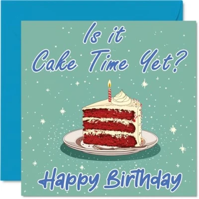 MAKE THEM SMILE WITH THIS FUNNY BIRTHDAY CARD: This exceptional quality trending birthday card shows a design of various cake designs with the funny text "Is It Cake Time Yet?". If you are looking for awesome birthday cards, then this happy birthday card is bound to make them smile. This could also be for Best Friend, Work Colleague, Brother, Sister, Grandad, Grandma, Nanny, Cousin, Mum or Dad. WHAT DO YOU GET: The card is printed on one side and BLANK ON THE INSIDE to allow you to write your very own message. The unique manly design is printed on a specially sourced and environmentally responsible board. At 360 microns thick the natural white one-sided gloss board has a quality look and feel. Supplied with a coloured gummed envelope to complement the design and ready to be sealed and sent in the post. NO INK SMUDGES: There is nothing worse than writing inside a card to find that the shiny surface makes the ink smudge. This is why we use a high quality one sided coated board. The uncoated side will absorb more of the ink from your pen to make smudging a thing of the past. SIZES: Greeting Card = 145mm x 145mm, Envelope = 155mm x 155mm, Card Thickness = 360 micron. Great friend birthday cards, female birthday card, 40th birthday card, happy birthday Son cards, friend 21st birthday cards, Daughter birthday card. MADE AND QUALITY CHECKED IN THE UK: We print and manufacture all our product right her in the UK so you can be sure of a fast turnaround and a product that is expertly made. Using environmentally responsible premium board our card is conscious of the responsible management of the world's forests.