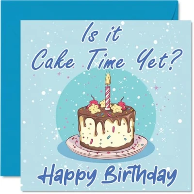 MAKE THEM SMILE WITH THIS FUNNY BIRTHDAY CARD: This exceptional quality trending birthday card shows a design of various cake designs with the funny text "Is It Cake Time Yet?". If you are looking for awesome birthday cards, then this happy birthday card is bound to make them smile. This could also be for Best Friend, Work Colleague, Brother, Sister, Grandad, Grandma, Nanny, Cousin, Mum or Dad. WHAT DO YOU GET: The card is printed on one side and BLANK ON THE INSIDE to allow you to write your very own message. The unique manly design is printed on a specially sourced and environmentally responsible board. At 360 microns thick the natural white one-sided gloss board has a quality look and feel. Supplied with a coloured gummed envelope to complement the design and ready to be sealed and sent in the post. NO INK SMUDGES: There is nothing worse than writing inside a card to find that the shiny surface makes the ink smudge. This is why we use a high quality one sided coated board. The uncoated side will absorb more of the ink from your pen to make smudging a thing of the past. SIZES: Greeting Card = 145mm x 145mm, Envelope = 155mm x 155mm, Card Thickness = 360 micron. Great friend birthday cards, female birthday card, 40th birthday card, happy birthday Son cards, friend 21st birthday cards, Daughter birthday card. MADE AND QUALITY CHECKED IN THE UK: We print and manufacture all our product right her in the UK so you can be sure of a fast turnaround and a product that is expertly made. Using environmentally responsible premium board our card is conscious of the responsible management of the world's forests.