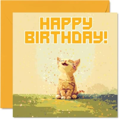 Birthday Cards for Men Women Pixel Art Cat Happy Card Brother Sister Son Daughter Uncle Aunt Colleague Friend 145mm x Bday Greeting