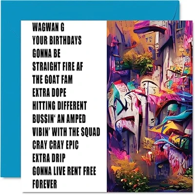 MAKE THEM SMILE WITH THIS EPIC BIRTHDAY CARD: This exceptional quality birthday card for her shows a design in street art graffiti style with the words " Wagwan G, your birthdays gonna be straight fire AF the GOAT fam, extra dope, hitting different, bussin an amped, vibin' with the squad, cray cray epic, extra drip, gonna live rent free forever ". This could also be for Best Friend, Work Colleague, Brother, Uncle, Colleague, Sister, Cousin or Auntie. WHAT DO YOU GET: The card is printed on one side and BLANK ON THE INSIDE to allow you to write your very own message. The unique cheeky design is printed on a specially sourced and environmentally responsible board. At 360 microns thick the natural white one-sided gloss board has a quality look and feel. Supplied with a coloured gummed envelope to complement the design and ready to be sealed and sent in the post. NO INK SMUDGES: There is nothing worse than writing inside a card to find that the shiny surface makes the ink smudge. This is why we use a high quality one sided coated board. The uncoated side will absorb more of the ink from your pen to make smudging a thing of the past. SIZES: Greeting Card = 145mm x 145mm, Envelope = 155mm x 155mm, Card Thickness = 360 micron. MADE AND QUALITY CHECKED IN THE UK: We print and manufacture all our product right her in the UK so you can be sure of a fast turnaround and a product that is expertly made. Using environmentally responsible premium board our card is conscious of the responsible management of the world's forests.