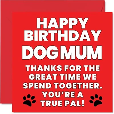 MAKE MUM SMILE WITH THIS HILARIOUS CARD TO SAY HAPPY BIRTHDAY FROM THE DOG: This exceptional quality mothers day card for her shows the design "Happy Birthday Dog Mum Thanks For The Great Time We Spend Together You're A True Pal!". If you are looking for beautiful birthday cards from the dog, then this happy mothers day card is bound to make them laugh. Not just for mothers day gifts for Mum this could also be a birthday card for Dog Mum, Mother, Mummy, Mom, Mama, Mama, or Mommy. WHAT DO YOU GET: The card is printed on one side and BLANK ON THE INSIDE to allow you to write your very own message. The unique fun design is printed on a specially sourced and environmentally responsible board. At 360 microns thick the natural white one-sided gloss board has a quality look and feel. Supplied with a coloured gummed envelope to complement the design and ready to be sealed and sent in the post. NO INK SMUDGES: There is nothing worse than writing inside a card to find that the shiny surface makes the ink smudge. This is why we use a high quality one sided coated board. The uncoated side will absorb more of the ink from your pen to make smudging a thing of the past. Happy birthday Mum cards, Mummy birthday cards, birthday card from the dog, valentines from the dog. SIZES: Greeting Card = 145mm x 145mm, Envelope = 155mm x 155mm, Card Thickness = 360 micron. Great Dog Mum mothers day cards from the dog. Mum birthday cards from Dog, birthday cards for Mum, birthday card Mummy, Mum birthday cards from Pet, Mum cards birthday, valentine card from the dog, presents from the dog, gifts from the dog to Mum. MADE AND QUALITY CHECKED IN THE UK: We print and manufacture all our product right her in the UK so you can be sure of a fast turnaround and a product that is expertly made. Using the very best Forest Stewardship Council certified board our card is conscious of the responsible management of the world's forests - birthday cards Mum, moter day cards from dog, Step Mum birthday card, Mums birthday card.