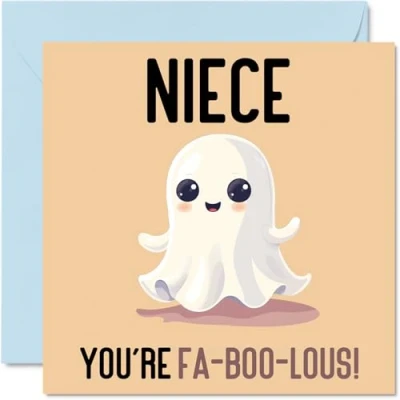 MAKE YOUR NIECE LAUGH WITH THIS FUNNY BIRTHDAY CARD NIECE: This exceptional quality birthday card for her shows the design of a cute ghost with the words "Niece You're Fa-Boo-lous". If you are looking for beautiful birthday greetings cards for her, then this funny happy birthday card is bound to make them smile. Not just for birthday gifts for Niece this could also be a birthday card for your Niece. WHAT DO YOU GET: The card is printed on one side and BLANK ON THE INSIDE to allow you to write your very own message. The unique fun design is printed on a specially sourced and environmentally responsible board. At 360 microns thick the natural white one-sided gloss board has a quality look and feel. Supplied with a coloured gummed envelope to complement the design and ready to be sealed and sent in the post. NO INK SMUDGES: There is nothing worse than writing inside a card to find that the shiny surface makes the ink smudge. This is why we use a high quality one sided coated board. The uncoated side will absorb more of the ink from your pen to make smudging a thing of the past. Happy birthday Daughter cards, Daughter birthday card, Step Daughter birthday cards, 21st birthday card for her, 18th birthday cards for women. SIZES: Greeting Card = 148mm x 210mm, Envelope = 150mm x 212mm, Card Thickness = 360 micron. Great Daughter birthday cards from Mum and Dad. Daughter birthday cards from Parents, birthday card Daughter , Daughter birthday card, Daughter birthday cards from Dad, special Daughter birthday cards. MADE AND QUALITY CHECKED IN THE UK: We print and manufacture all our product right her in the UK so you can be sure of a fast turnaround and a product that is expertly made. Using environmentally responsible premium board our card is conscious of the responsible management of the world's forests - birthday cards Daughter, Daughter birthday card, Daughters birthday card.