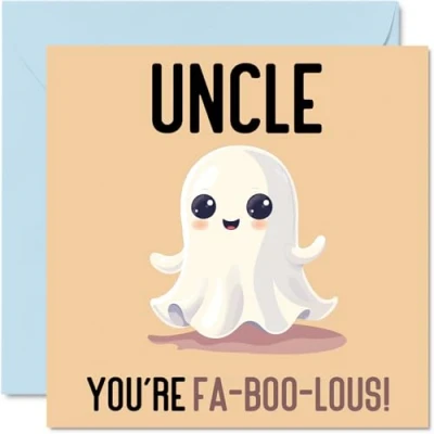 MAKE YOUR UNCLE LAUGH WITH THIS FUNNY BIRTHDAY CARD UNCLE: This exceptional quality birthday card for him shows the design of a cute ghost with the words "Uncle You're Fa-Boo-lous". If you are looking for beautiful birthday greetings cards for him, then this funny happy birthday card is bound to make them smile. Not just for birthday gifts for Uncle this could also be a birthday card for your Uncle or Step Uncle. WHAT DO YOU GET: The card is printed on one side and BLANK ON THE INSIDE to allow you to write your very own message. The unique fun design is printed on a specially sourced and environmentally responsible board. At 360 microns thick the natural white one-sided gloss board has a quality look and feel. Supplied with a coloured gummed envelope to complement the design and ready to be sealed and sent in the post. NO INK SMUDGES: There is nothing worse than writing inside a card to find that the shiny surface makes the ink smudge. This is why we use a high quality one sided coated board. The uncoated side will absorb more of the ink from your pen to make smudging a thing of the past. Happy birthday Uncle cards, Uncle birthday card, Step Uncle birthday cards, 50th birthday card for him, 40th birthday cards for men. SIZES: Greeting Card = 148mm x 210mm, Envelope = 150mm x 212mm, Card Thickness = 360 micron. Great Uncle birthday cards from Niece and Nephew. Uncle birthday cards from Nephew, birthday card Uncle, Uncle birthday card, Uncle birthday cards from Niece, special Uncle birthday cards. MADE AND QUALITY CHECKED IN THE UK: We print and manufacture all our product right her in the UK so you can be sure of a fast turnaround and a product that is expertly made. Using environmentally responsible premium board our card is conscious of the responsible management of the world's forests - birthday cards Uncle, Uncle birthday card, Uncles birthday card.