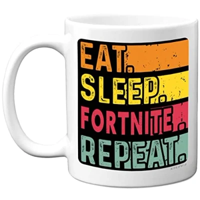MAKE THEM GIGGLE: If you are looking for a leaving gift for your colleagues then look no further. This exceptional quality mug bears the wording - Eat, Sleep, Fortnite, Repeat - It's bound to make them smile. Not just a retirement gifts for men funny, this could be as a birthday or Christmas gifts for her or womens retirement gifts. WHAT DO YOU GET: This funny leaving present for her or him is made from the highest quality mugs available on the market. An 11oz ceramic gloss finished mug with a large handle for ease of use. The cheeky design is printed on both sides so no one will miss it. Retirement gifts for her and incredibly funny gifts for women from Stuff4 Ltd.Fortnite birthday present PACKED FOR PROTECTION: Every order is packed in a drop proof double walled cardboard Mug Mailer which are lightweight and strong enough to provide total protection. So have the birthday boy or girl in pieces and not the rude mugs.18th 21st 30 40th 50th 60th birthday gifts. MADE AND QUALITY CHECKED IN THE UK: We manufacture all our product right her in the UK so you can be sure of a fast turnaround and a product that is expertly made - retirement gift ideas from Stuff4.Fortnite Gaming Video Game birthday gifts. 11oz DISHWASHER AND MICROWAVE SAFE MUGS: Made from premium ceramic our 11oz heavyweight mugs are manufactured with a dishwasher safe premium coating. This means that the colours of your image will not fade even after multiple cycles (up to 800) through a dishwasher. They are also microwave safe.Fortnite gifts., Weight: 0.7495716908 Pounds, Manufacturer: STUFF4
