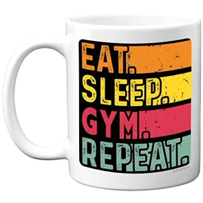 MAKE THEM GIGGLE: If you are looking for a leaving gift for your colleagues then look no further. This exceptional quality mug bears the wording - Eat, Sleep, Gym, Repeat - It's bound to make them smile. Not just a retirement gifts for men funny, this could be as a birthday or Christmas gifts for her or womens retirement gifts. WHAT DO YOU GET: This funny leaving present for her or him is made from the highest quality mugs available on the market. An 11oz ceramic gloss finished mug with a large handle for ease of use. The cheeky design is printed on both sides so no one will miss it. Retirement gifts for her and incredibly funny gifts for women from Stuff4 Ltd.Gym birthday present PACKED FOR PROTECTION: Every order is packed in a drop proof double walled cardboard Mug Mailer which are lightweight and strong enough to provide total protection. So have the birthday boy or girl in pieces and not the rude mugs.18th 21st 30 40th 50th 60th birthday gifts. MADE AND QUALITY CHECKED IN THE UK: We manufacture all our product right her in the UK so you can be sure of a fast turnaround and a product that is expertly made - retirement gift ideas from Stuff4.Gym Workout Fitness birthday gifts. 11oz DISHWASHER AND MICROWAVE SAFE MUGS: Made from premium ceramic our 11oz heavyweight mugs are manufactured with a dishwasher safe premium coating. This means that the colours of your image will not fade even after multiple cycles (up to 800) through a dishwasher. They are also microwave safe.Gym gifts.