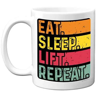 MAKE THEM GIGGLE: If you are looking for a leaving gift for your colleagues then look no further. This exceptional quality mug bears the wording - Eat, Sleep, Lift, Repeat - It's bound to make them smile. Not just a retirement gifts for men funny, this could be as a birthday or Christmas gifts for her or womens retirement gifts. WHAT DO YOU GET: This funny leaving present for her or him is made from the highest quality mugs available on the market. An 11oz ceramic gloss finished mug with a large handle for ease of use. The cheeky design is printed on both sides so no one will miss it. Retirement gifts for her and incredibly funny gifts for women from Stuff4 Ltd.Lift birthday present PACKED FOR PROTECTION: Every order is packed in a drop proof double walled cardboard Mug Mailer which are lightweight and strong enough to provide total protection. So have the birthday boy or girl in pieces and not the rude mugs.18th 21st 30 40th 50th 60th birthday gifts. MADE AND QUALITY CHECKED IN THE UK: We manufacture all our product right her in the UK so you can be sure of a fast turnaround and a product that is expertly made - retirement gift ideas from Stuff4.Lift Workout Weight Training birthday gifts. 11oz DISHWASHER AND MICROWAVE SAFE MUGS: Made from premium ceramic our 11oz heavyweight mugs are manufactured with a dishwasher safe premium coating. This means that the colours of your image will not fade even after multiple cycles (up to 800) through a dishwasher. They are also microwave safe.Lift gifts.