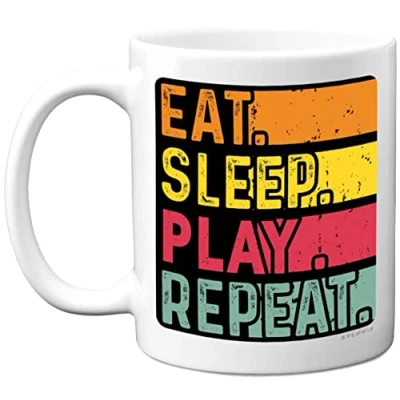 MAKE THEM GIGGLE: If you are looking for a leaving gift for your colleagues then look no further. This exceptional quality mug bears the wording - Eat, Sleep, Play, Repeat - It's bound to make them smile. Not just a retirement gifts for men funny, this could be as a birthday or Christmas gifts for her or womens retirement gifts. WHAT DO YOU GET: This funny leaving present for her or him is made from the highest quality mugs available on the market. An 11oz ceramic gloss finished mug with a large handle for ease of use. The cheeky design is printed on both sides so no one will miss it. Retirement gifts for her and incredibly funny gifts for women from Stuff4 Ltd.Play birthday present PACKED FOR PROTECTION: Every order is packed in a drop proof double walled cardboard Mug Mailer which are lightweight and strong enough to provide total protection. So have the birthday boy or girl in pieces and not the rude mugs.18th 21st 30 40th 50th 60th birthday gifts. MADE AND QUALITY CHECKED IN THE UK: We manufacture all our product right her in the UK so you can be sure of a fast turnaround and a product that is expertly made - retirement gift ideas from Stuff4.Play Sport Music birthday gifts. 11oz DISHWASHER AND MICROWAVE SAFE MUGS: Made from premium ceramic our 11oz heavyweight mugs are manufactured with a dishwasher safe premium coating. This means that the colours of your image will not fade even after multiple cycles (up to 800) through a dishwasher. They are also microwave safe.Play gifts.