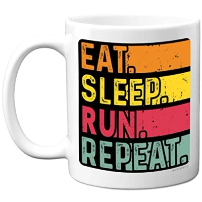 MAKE THEM GIGGLE: If you are looking for a leaving gift for your colleagues then look no further. This exceptional quality mug bears the wording - Eat, Sleep, Run, Repeat - It's bound to make them smile. Not just a retirement gifts for men funny, this could be as a birthday or Christmas gifts for her or womens retirement gifts. WHAT DO YOU GET: This funny leaving present for her or him is made from the highest quality mugs available on the market. An 11oz ceramic gloss finished mug with a large handle for ease of use. The cheeky design is printed on both sides so no one will miss it. Retirement gifts for her and incredibly funny gifts for women from Stuff4 Ltd.Run birthday present PACKED FOR PROTECTION: Every order is packed in a drop proof double walled cardboard Mug Mailer which are lightweight and strong enough to provide total protection. So have the birthday boy or girl in pieces and not the rude mugs.18th 21st 30 40th 50th 60th birthday gifts. MADE AND QUALITY CHECKED IN THE UK: We manufacture all our product right her in the UK so you can be sure of a fast turnaround and a product that is expertly made - retirement gift ideas from Stuff4.Run Fitness Exercise birthday gifts. 11oz DISHWASHER AND MICROWAVE SAFE MUGS: Made from premium ceramic our 11oz heavyweight mugs are manufactured with a dishwasher safe premium coating. This means that the colours of your image will not fade even after multiple cycles (up to 800) through a dishwasher. They are also microwave safe.Run gifts.